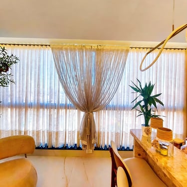 O cliente buscava uma solução que mantivesse a sensação de amplitude, mas que ao mesmo tempo trouxesse aconchego e sofisticação. A combinação da cortina de linho com o xale em macramê atendeu exatamente a essa necessidade, unindo funcionalidade e design em um único projeto.