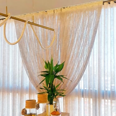 O linho foi escolhido por sua textura natural e capacidade de filtrar a luz de forma suave, proporcionando conforto visual ao longo do dia. Já o xale em macramê adiciona um toque artesanal e exclusivo, criando um ponto focal delicado que valoriza o espaço sem excessos.