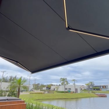A Decampos desenvolveu e instalou um toldo elétrico automatizado, com acionamento por controle remoto, permitindo total controle da abertura e do recolhimento da cobertura de forma simples e precisa. O sistema foi projetado sob medida para se integrar à arquitetura do espaço, respeitando proporções, acabamentos e o uso cotidiano do ambiente.